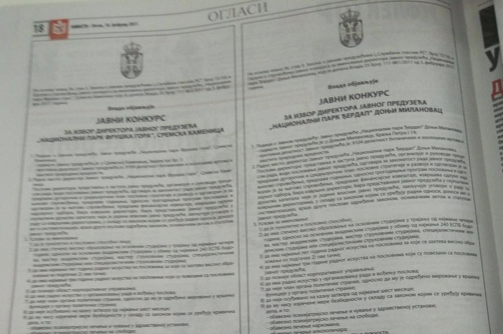 Javni konkurs su objavljen za preduzeća Putevi Srbije, Transnafta, Koridori Srbije, Državna lutrija Srbije, kao i za četiri nacionalna parka: Tara, Đerdap, Fruška gora i Kopaonik.