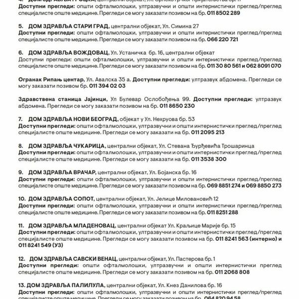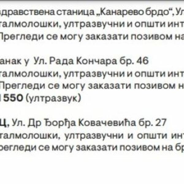 Naime, za penzionere će sutra od 8 do 16 časova u matičnim Domovima zdravlja biti organizovani preventivni zdravstveni pregledi i to: oftamološki, ultrazvučni i opšti internistički pregledi/pregled specijaliste opšte medicine