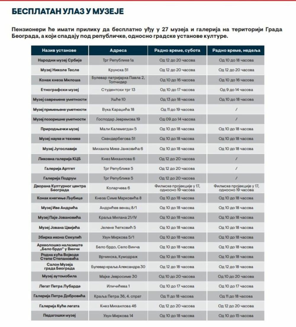 Takođe, penzioneri će imati priliku da besplatno uđu u 27 muzeja i galerije, a koji su deo gradske ustanove kulture, poput: muzeja Nikole Tesle, konaka Knjeginje Ljubice, Narodnog muzeja...