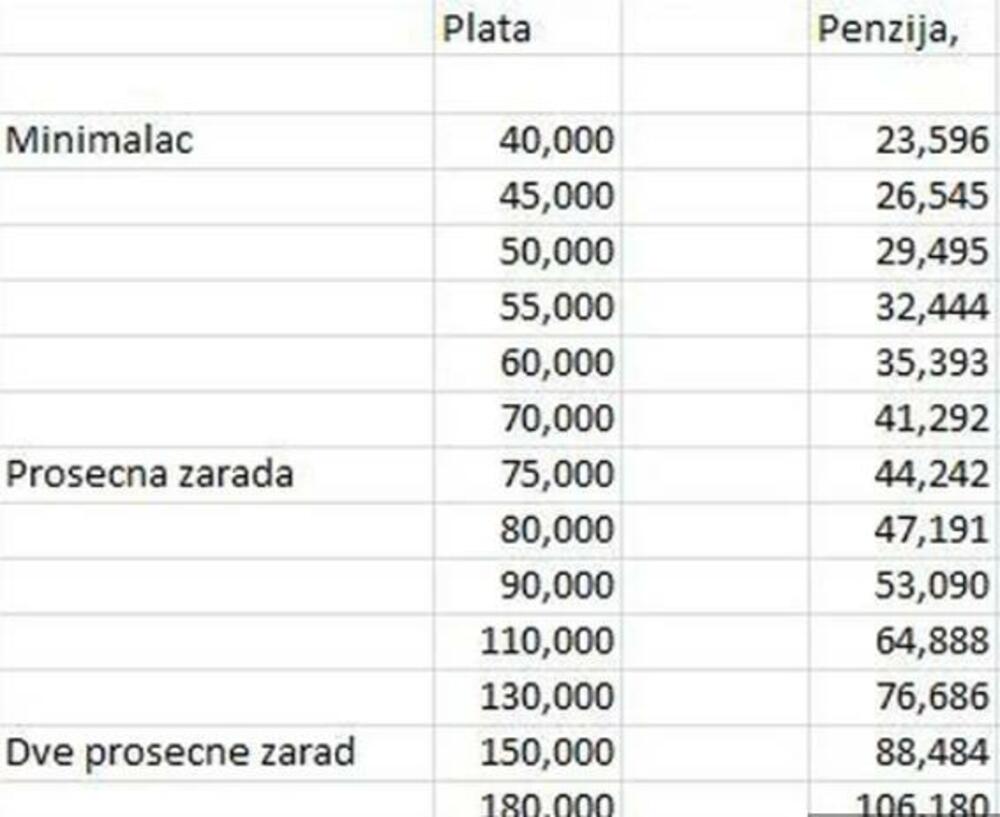 Za one koji su 40 godina zarađivali više od minimalne zarade i platu od oko 50.000 dinara mesečno penzija bi bila 29.495 dinara. One koji su zarađivali 70.000 dinara sledovala bi penzija od 41.290 dinara, dok za zaradu od 90.000 dinara može da se očekuje penzija od oko 53.000 (53.090 dinara).