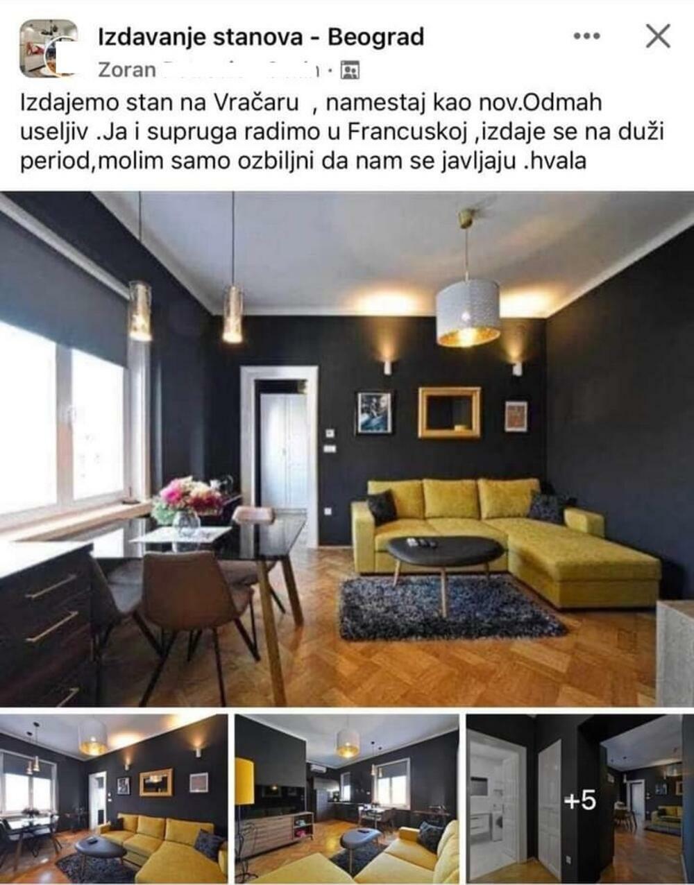 - Izdajemo stan na Vračaru, nameštaj kao nov. Odmah useljiv. Supruga i ja radimo u Francuskoj, izdaje se na duži period, molim samo ozbiljni da nam se javljaju - navodi se u opisu oglasa čoveka koji se predstavio kao Zoran.