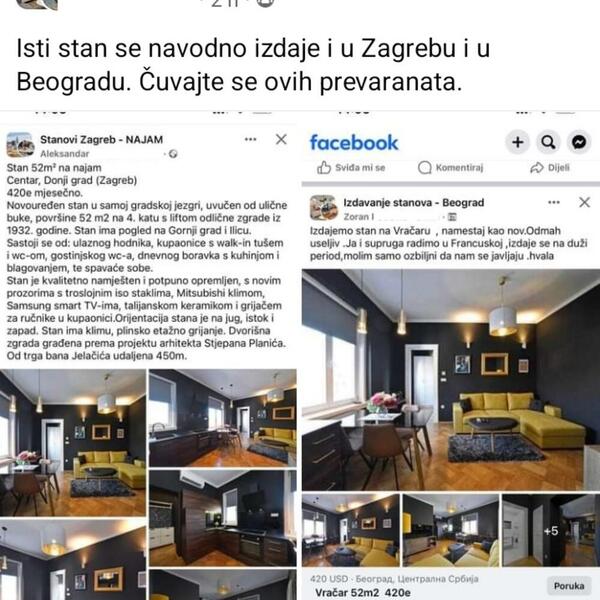 - Isti stan se navodno izdaje i u Zagrebu i u Beogradu. Čuvajte se ovih prevaranata - navodi se u upozorenju.