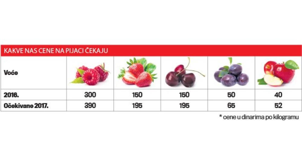 Cena voća, zbog niskih temperatura, snega i mraza usred aprila, mogla bi da bude povećana od deset do 30 odsto, u zavisnosti od konačne štete, koja će definitivno moći da se proceni tek kad se stabilizuju vremenske prilike, smatraju stručnjaci.