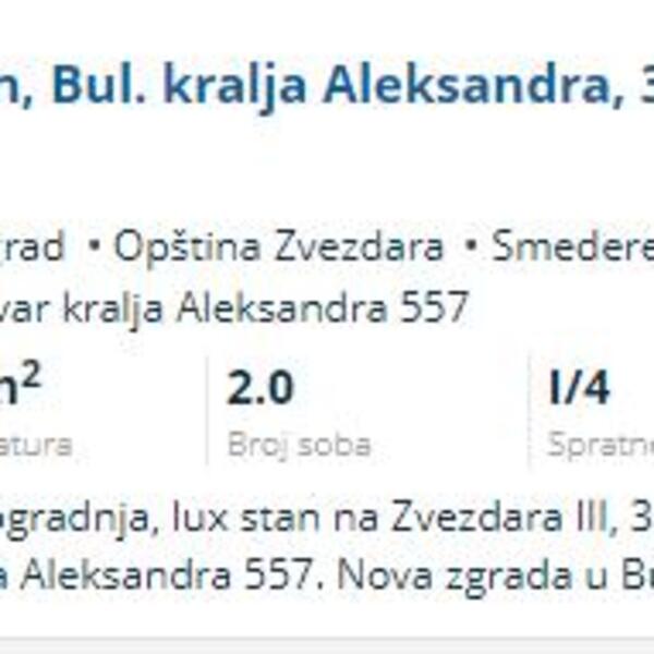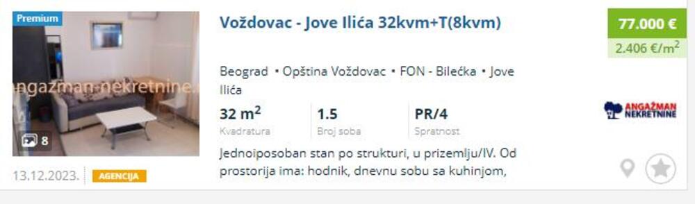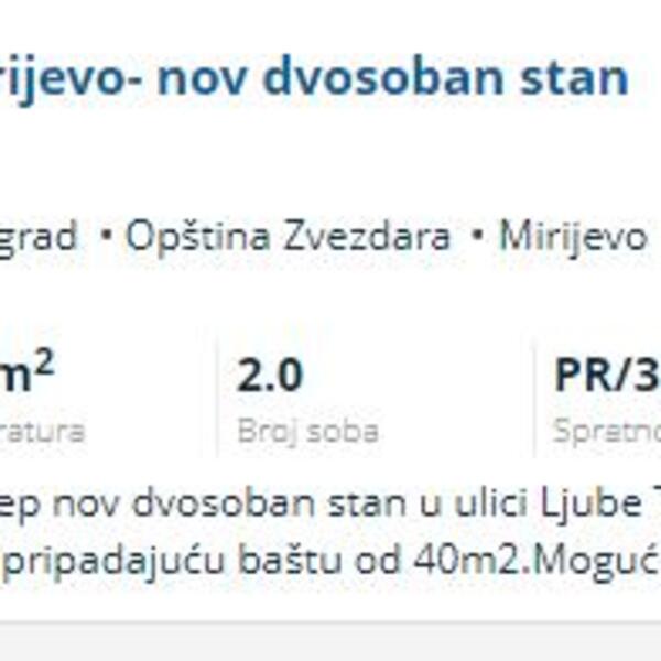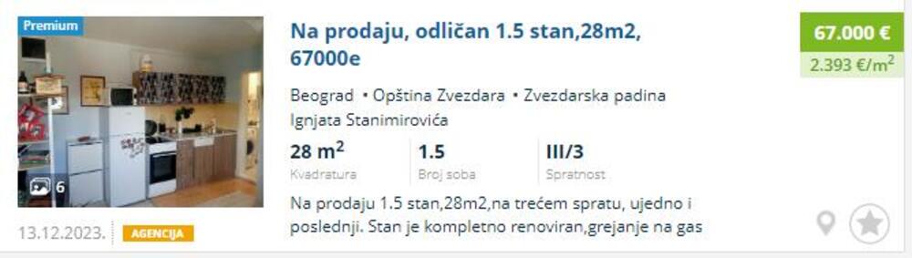 Jedan od stanova koji je oglašen za 80.000 evra nalazi se kod Zvezdarske šume i ima 39 kvadrata. U pitanju je jednoiposobni stan sa etažnim grejanjem, a nalazi se na drugom spratu u zgradi koja ima ukupno četiri sprata.