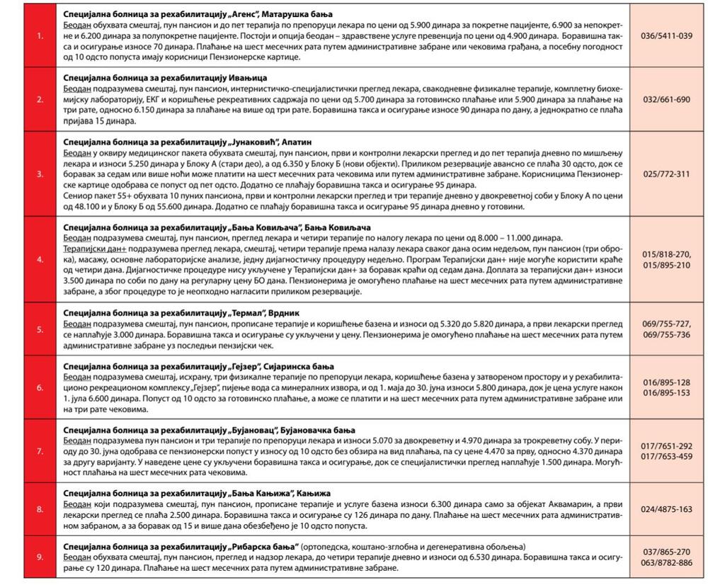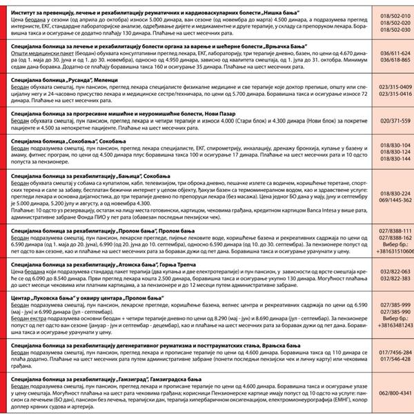 Među objektima koji nude povoljnije uslove za penzionere izdvojićemo i Specijalnu bolnicu za bolesti štitaste žlezde i bolesti metabolizma „Zlatibor”, koja daje popust od 10 odsto penzionerima na boravak od minimum sedam dana, kao i plaćanje na šest rata čekovima građana i platnim karticama, dok Institut za rehabilitaciju „Selters Mladenovac” pruža mogućnost plaćanja na četiri rate čekovima građana.