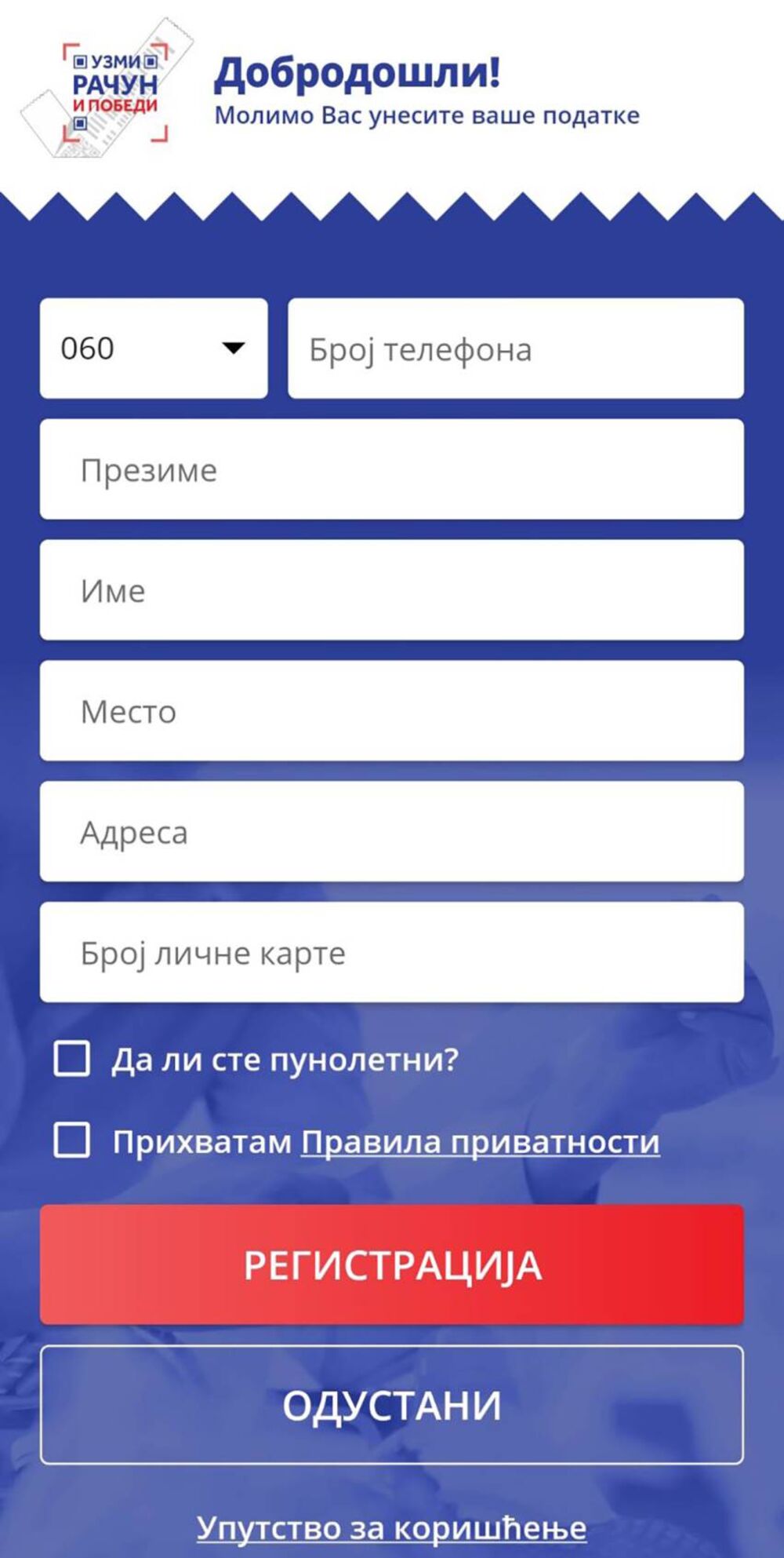 Nakon instalacije je neophodno uneti osnovne podatke - ime i prezime, mejl adresu, adresu, broj telefona i broj lične karte.