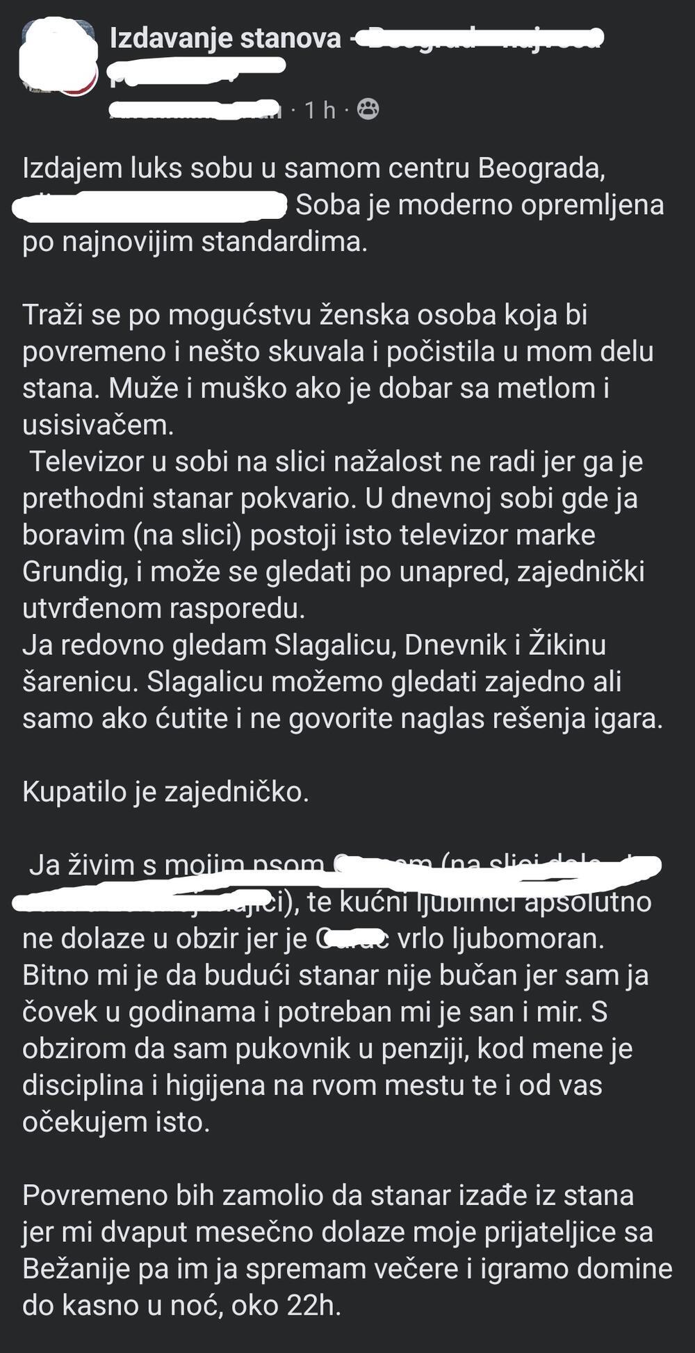 U jednoj Fejsbuk grupi za izdavanje stanova pojavio se oglas za izdavanje sobe koji je nasmejao mnoge članove. Sudeći po reakcijama mnogi su pomislili da je ovo šala, ali i većina njih je bila u šoku zbog zahteva stanodavca.