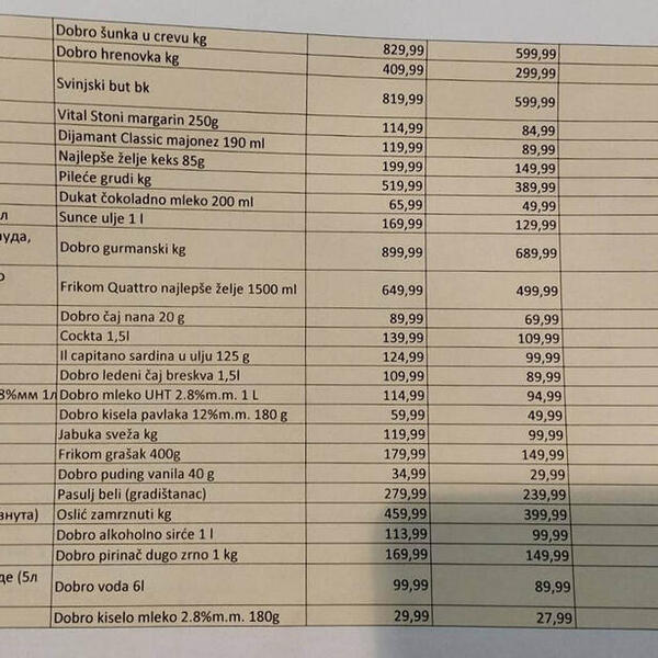 Primera radi, stišnjena šunka će pojeftiniti sa 1.199,99 dinara na 799,99 dinara, šunka u crevu sa 829,99 na 599,99 dinara, krompir sa 84,99 na 59,99 dinara, sir sa 899,99 na 689,99 dinara.