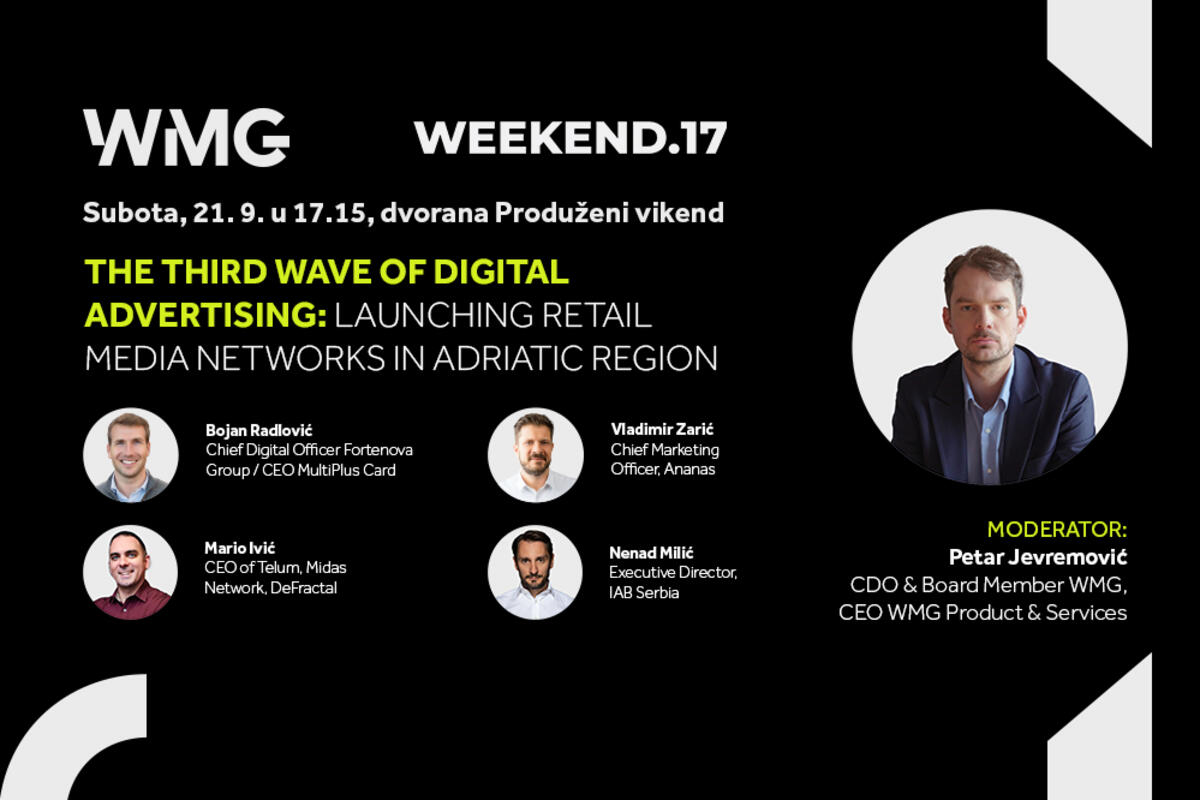 Moderator panela biće Petar Jevremović, CDO i član Uprave WMG, te CEO WMG Product & Services, koji će voditi razgovor o značaju RMN-a za regionalna tržišta. Pored njega, učestvovaće i renomirani stručnjaci iz industrije: Bojan Radlović, Chief Digital Officer u Fortenova grupi, Vladimir Zarić, Chief Marketing Officer u Ananas E-commerce, Mario Ivić, CEO DeFractal/Telum/Midas, i Nenad Milić, Executive Director u IAB Serbia.