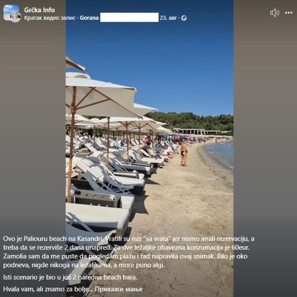 - Ovo je Paliouru beach na Kasandri. Vratili su nas "sa vrata" jer nismo imali rezervaciju, a treba da se rezerviše dva dana unapred. Za dve ležaljke obavezna konzumacija je 60 evra. Zamolila sam da me puste da pogledam plažu i tad napravila ovaj snimak. Bilo je oko podneva, nigde nikoga na ležaljkama, a more puno algi - napisala je Gorana u Fejsbuk grupi "Grčka info".