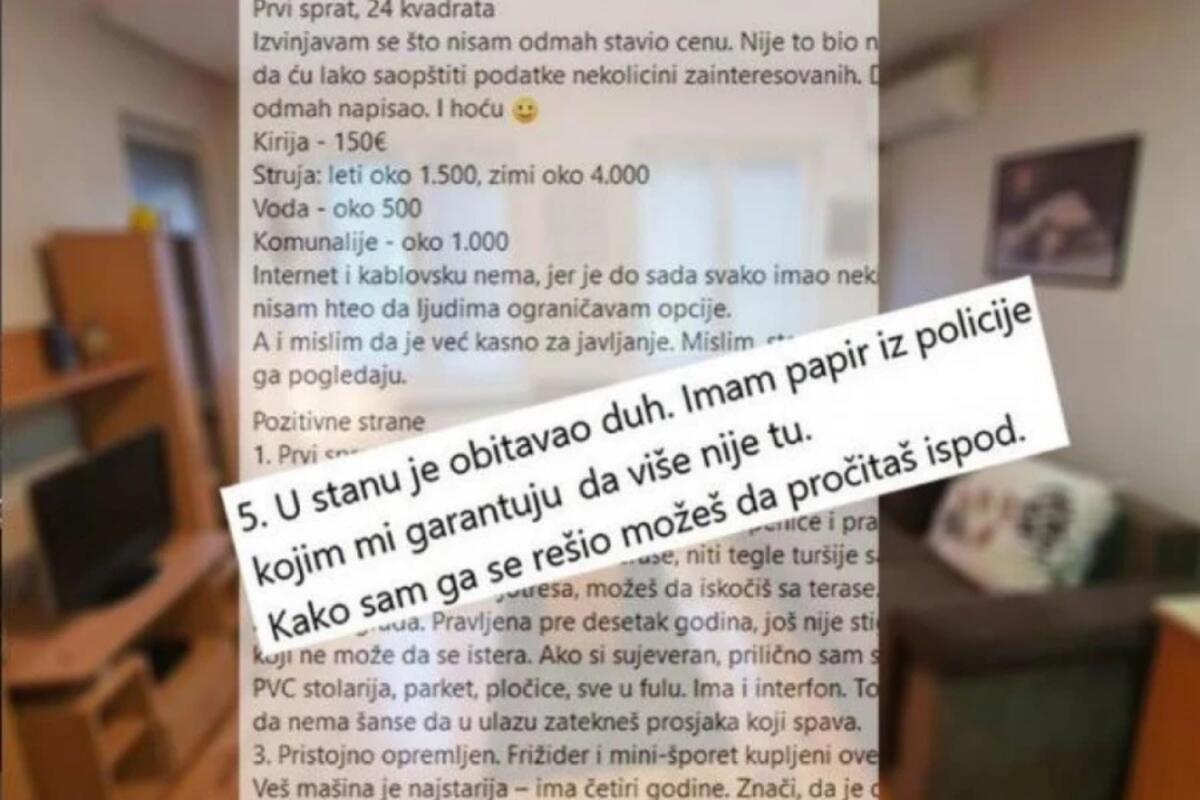 Pisac Ivan Drajzl okačio je na Facebook oglas za iznajmljive stana koji je nasmejao mnoge korisnike na društvenim mrežama i privukao mnoge interesente.