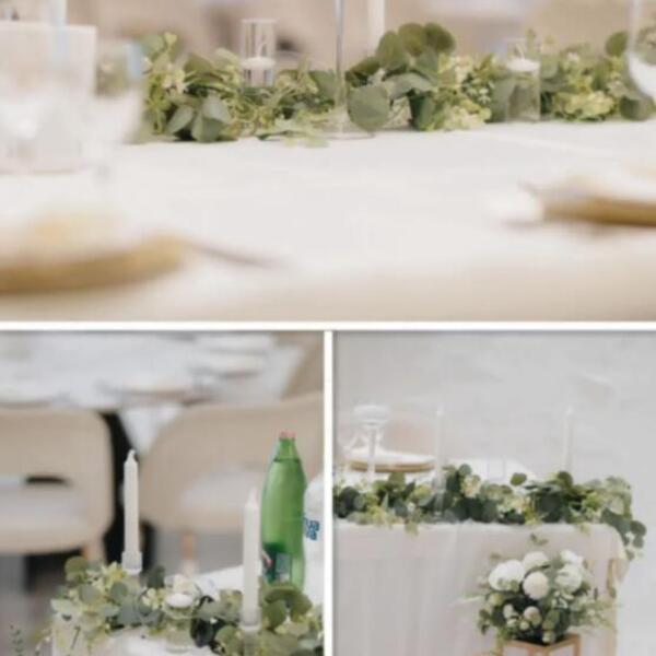 Za dekoraciju je sa Temua poručila sveće, zelenilo i til za ukrašavanje dvorišta i kapije, zatim personalizovane plastične čaše za šampanjac sa mašnama i imenima, kompletnu dekoraciju za salu, glavni sto i foto-zonu. Pored toga, naručila je i cvetove za kićenje svatova, dok je sama pravila narukvice za goste.