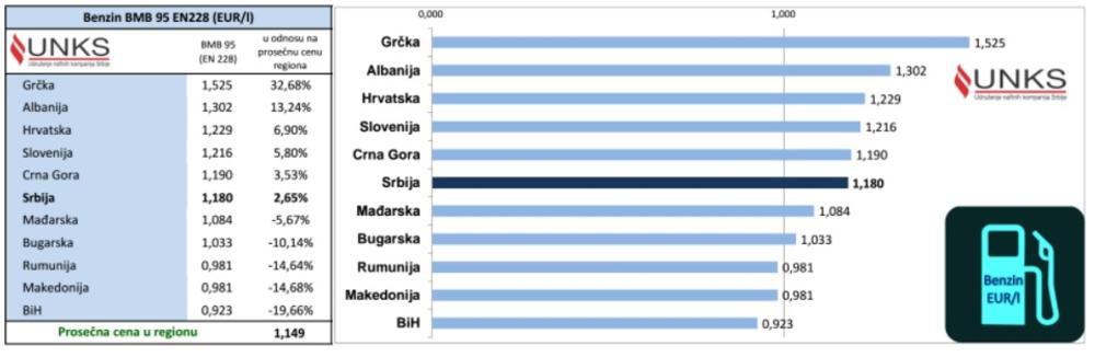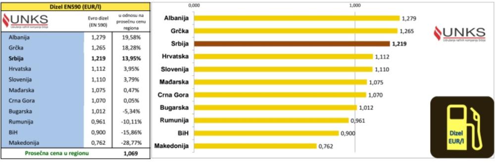 Isti trend zabeležen je i u većini zemalja u okruženju. U Crnoj gori je bentin jeftiniji za 3 evrocenta dok je cena dizela ostala nepromenjena, u Grčkoj je prosečna cena dizela takođe ostala nepromenjena dok je benzin u proseku jeftiniji za 2 evrocenta, u Makedoniji je cena benzina niža za 2 denara, a dizela za 1. Detaljan pregled prosečnih maloprodajnih cena goriva u Srbiji deset zemalja u okruženju izražen u evrima po srednjem kursu nacionalnih banaka je data na dijagramu u prilogu.