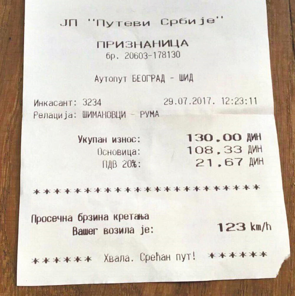 To o čemu je govorio, sada se primenjuje i u praksi. Na Fejsbuku su već osvanule priznanice koje imaju novu stavku - „prosečna brzina kretanja vašeg vozila je...“, kao i podatak da li ste vozili brže od 120 na sat. Ako jeste, saobraćajcima koji su smešteni nadomak kućica za naplatu putarine to će biti signalizirano i bićete kažnjeni. Zasad se kazne za niža prekoračenja ne primenjuju.