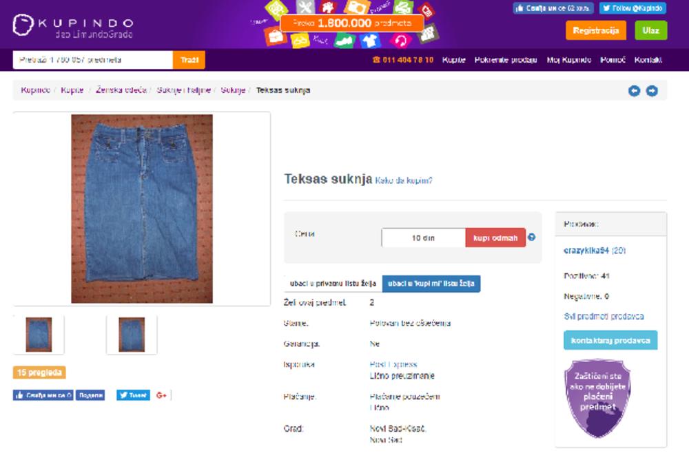 Suknja, najjeftinija na sajtu "Kupindo" može se naći za 10 dinara. Nema za dinar, ali ni ovo nije bogatstvo!