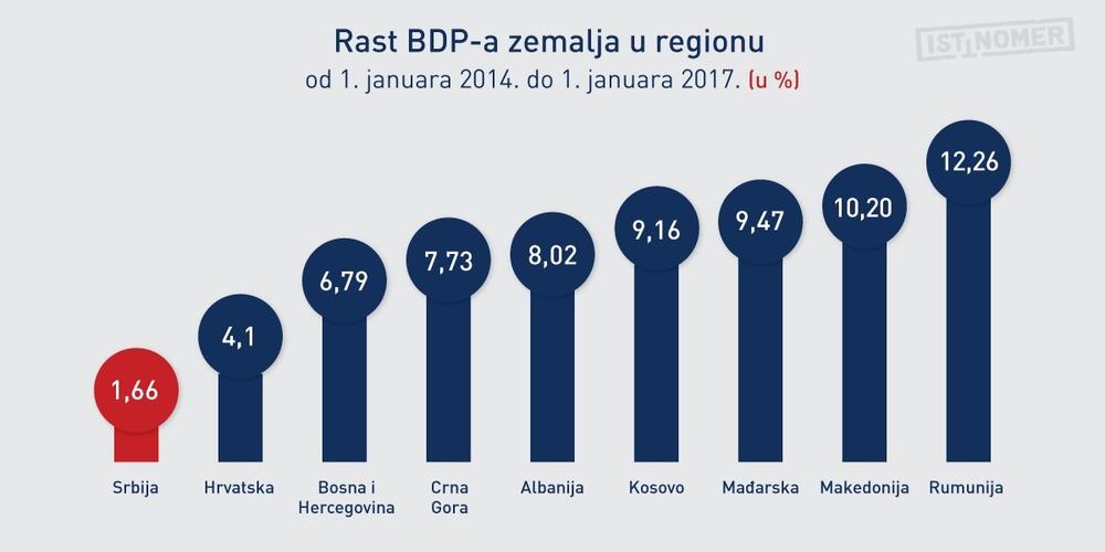 Upoređujući ovaj rast Srbije sa ostalim susednim zemljama, dolazi se do zaključka da je rast njenog BDP-a u ove tri godine daleko najsporiji: prva sledeća zemlja – Hrvatska – od 2014. godine povećala je svoj BDP za 4,1 odsto; slede Bosna i Hercegovina (ukupni rast 6,79 odsto), Crna Gora (7,73), Albanija (8,02), Kosovo (9,16), Mađarska (9,47), Makedonija (10,20), a najbrži rast imala je najveća susedna zemlja – Rumunija – i to za 12,26 odsto.