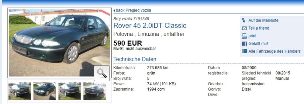 Tražili smo polovne dizelaše u Nemačkoj, preko sajta webauto.de i našli najnižu ponudu od 590 evra. Reč je o Roveru 450 iz 2000. koji je prešao 273 km.