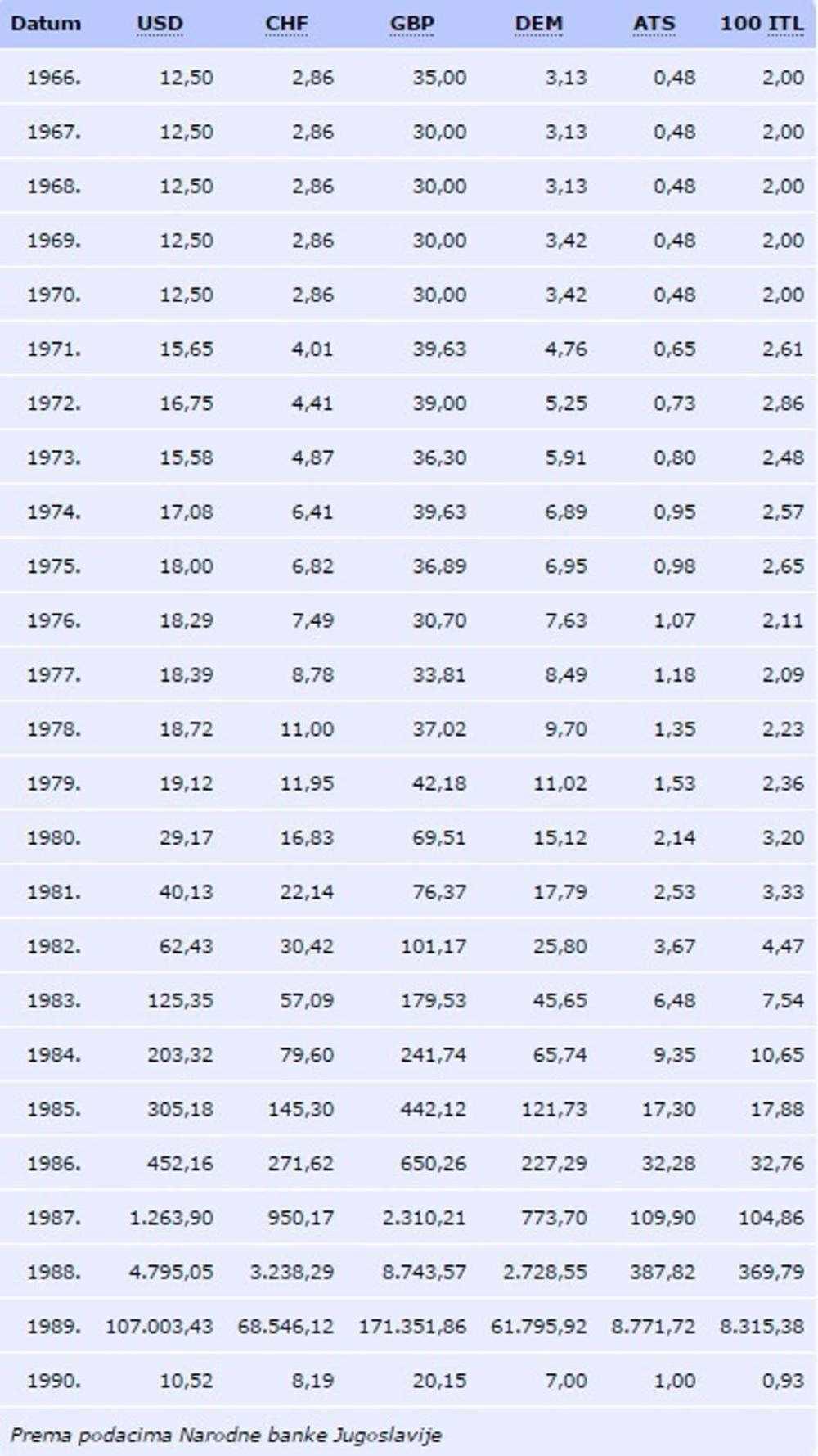 Pogledajte tečajeve Narodne banke Jugoslavije u odnosu dinara prema stranim valutama na kraju godine: