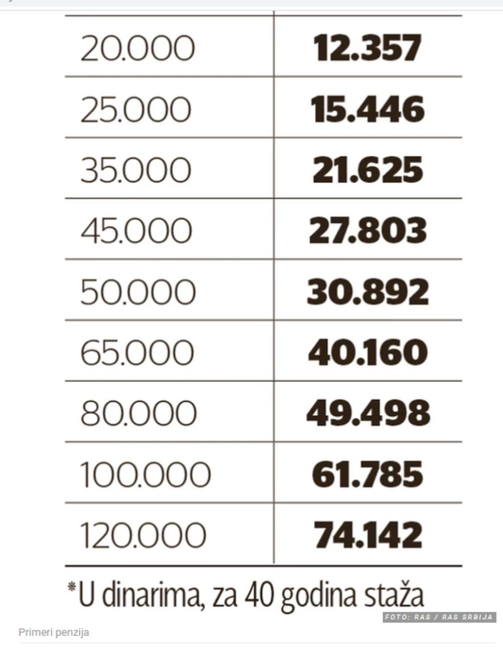 Praktično, za 40 godina staža i prosečnu zaradu kroz pune četiri decenije od oko 35.000 dinara možete računati na penziju tek nešto veću od 21.500 dinara.