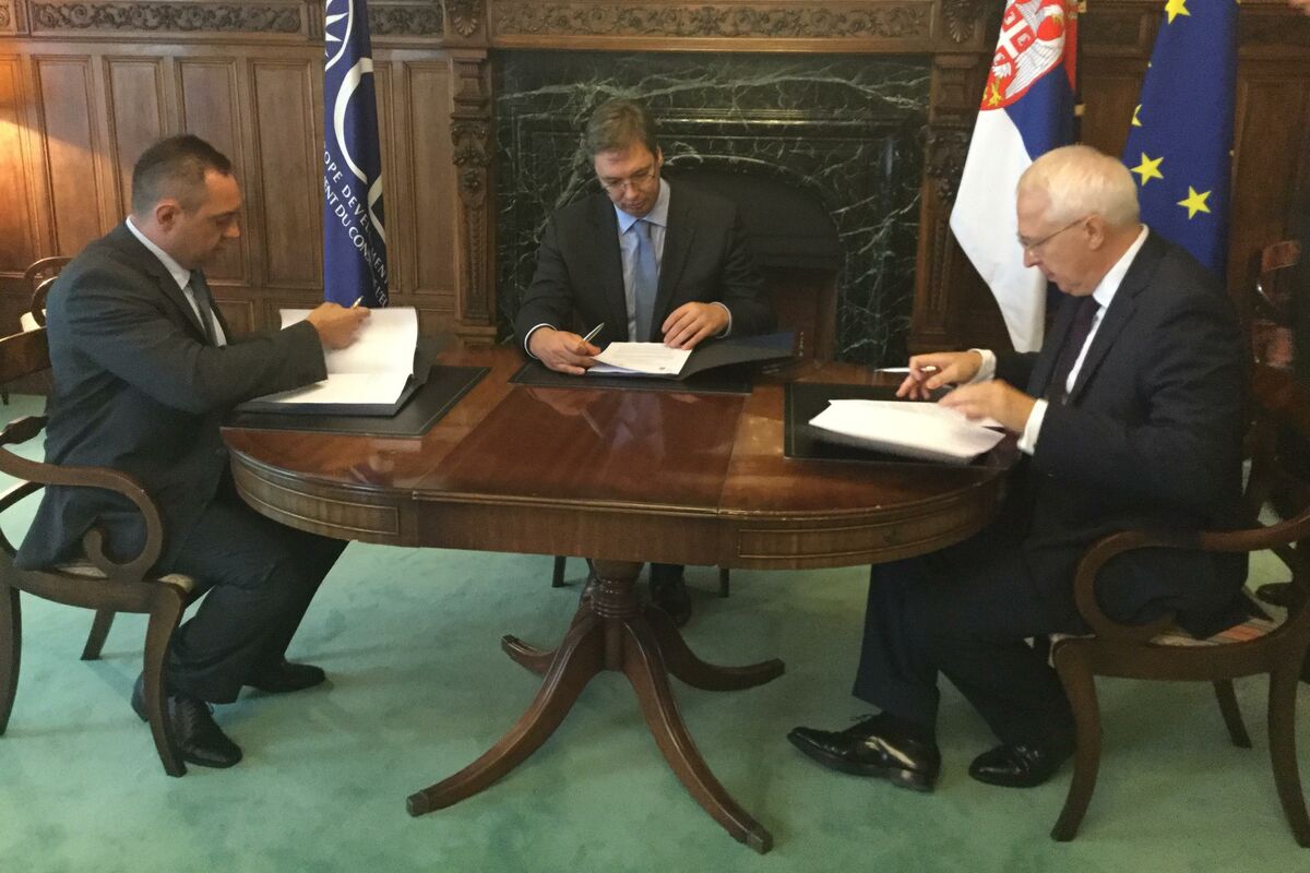 Ugovor je potpisan tokom sastanka predsednika Vlade Srbije Aleksandra Vučića sa direktorom Banke za razvoj Saveta Evrope Rolfom Venzelom, saopšteno je iz vlade.