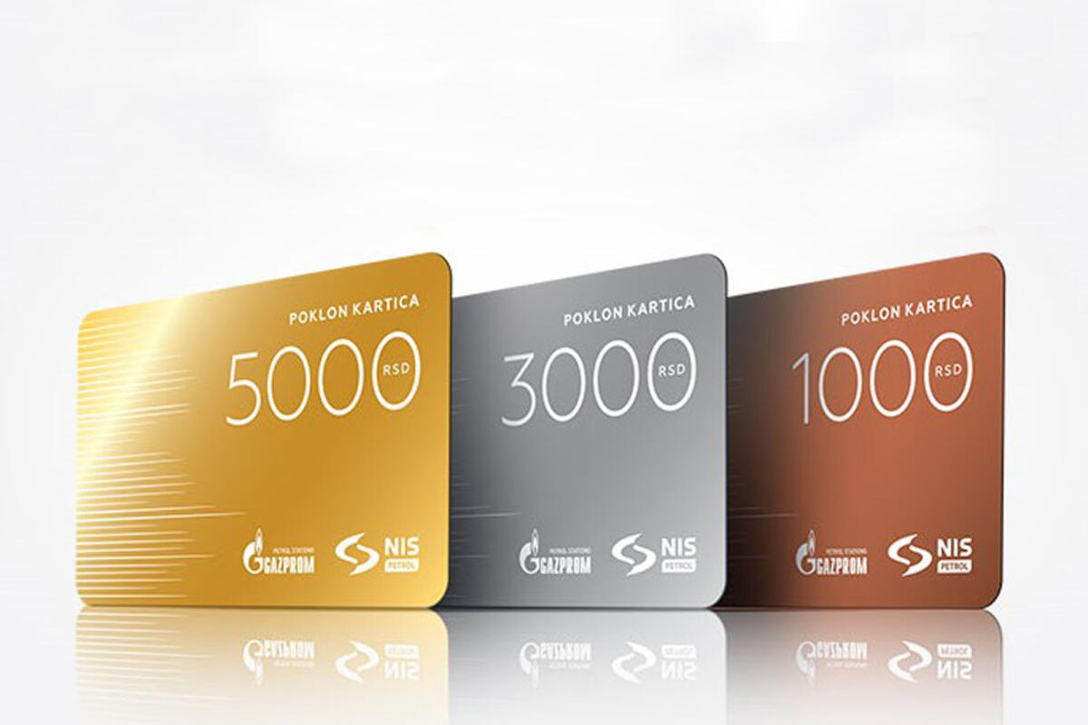 Poklon kartice dostupne su u vrednosti od 1.000, 3.000 ili 5.000 dinara, a korisnik naznačeni iznos može iskoristiti za kupovinu svih vrsta goriva i drugih proizvoda iz bogatog asortimana NIS Petrol i GAZPPROM benzinskih stanica. Dodatna prednost NIS poklon kartica je što se vrlo jednostavno mogu isporučiti – u vidu QR koda, potpuno pouzdano i bezbedno, i uvek su na dohvat ruke – u mobilnom uređaju!