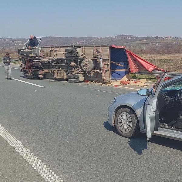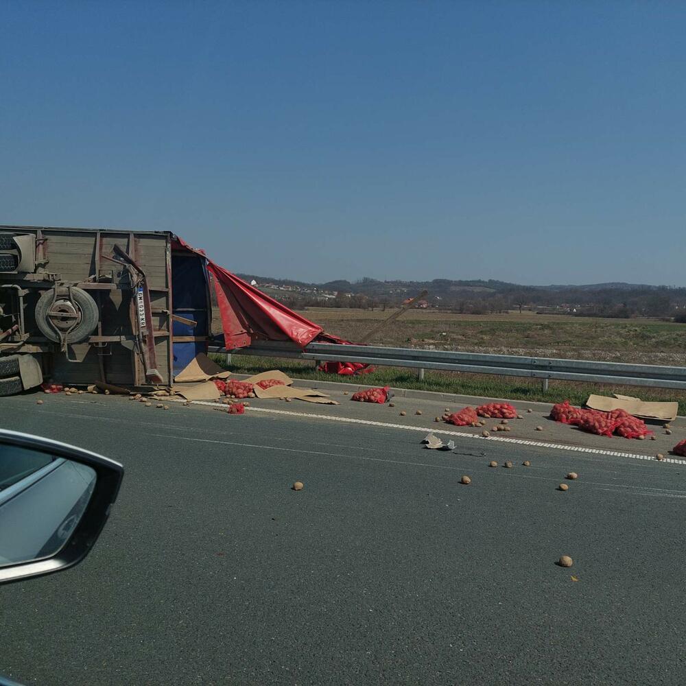 KROMPIR RASUT PO KOLOVOZU: Na autoputu Miloš Veliki PREVRNUT KAMION! (FOTO)
