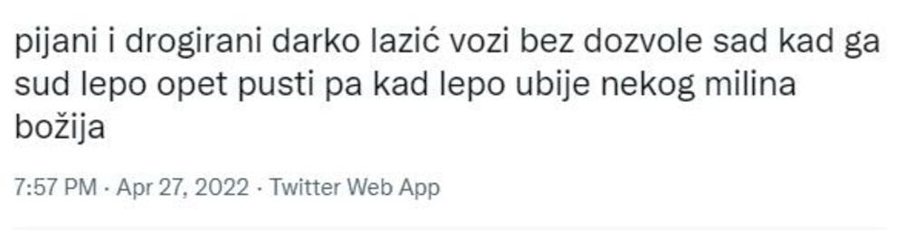 "Ako Darko Lazić i ovog puta prođe sa nekom smešnom kaznom i nanogicom, sledeći put kad vas zaustavi saobraćajna policija vi im samo pokažite sliku tog govečeta, i kažite da vas boli ku**c."