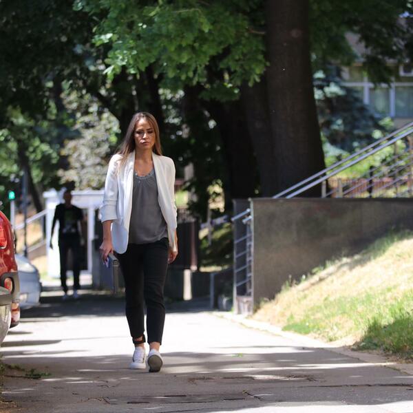 U Specijalni sud došla je u crnim pantalonama, belom sakou i belim patikama. Na desnoj nozi se vidi nanogica koju nosi.