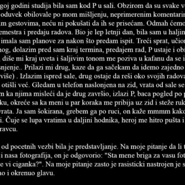 "Što se tiče neprimerenih izjava, fazona, toga je bilo svako malo, ali valjda kako smo klinci još to ne registrujemo kao nešto što treba prijaviti. Kažeš "Bože me sačuvaj" u sebi, "kakva budala" i čekaš kraj vežbi. Nakon što dočekah jednom prilikom kraj vežbi, svi su krenuli da izlaze i uputila sam se ka čuvenom ... ne bih li ga pitala oko predaje kolokvijuma, neću biti tu za isti - imam operaciju, da li mogu ranije ili kasnije da predam", navodi ona i dodaje: