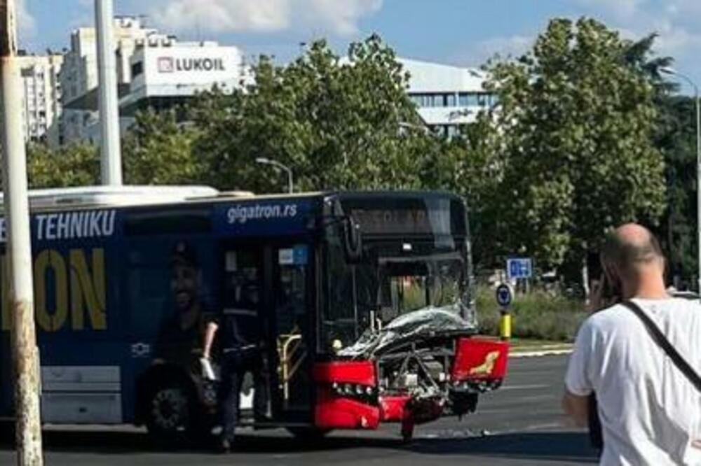Na kružnom toku na Novom Beogradu dogodila se saobraćajna nesreća. U sudaru su učestvovali automobil i autobus, a automobil je završio na zelenoj površini.