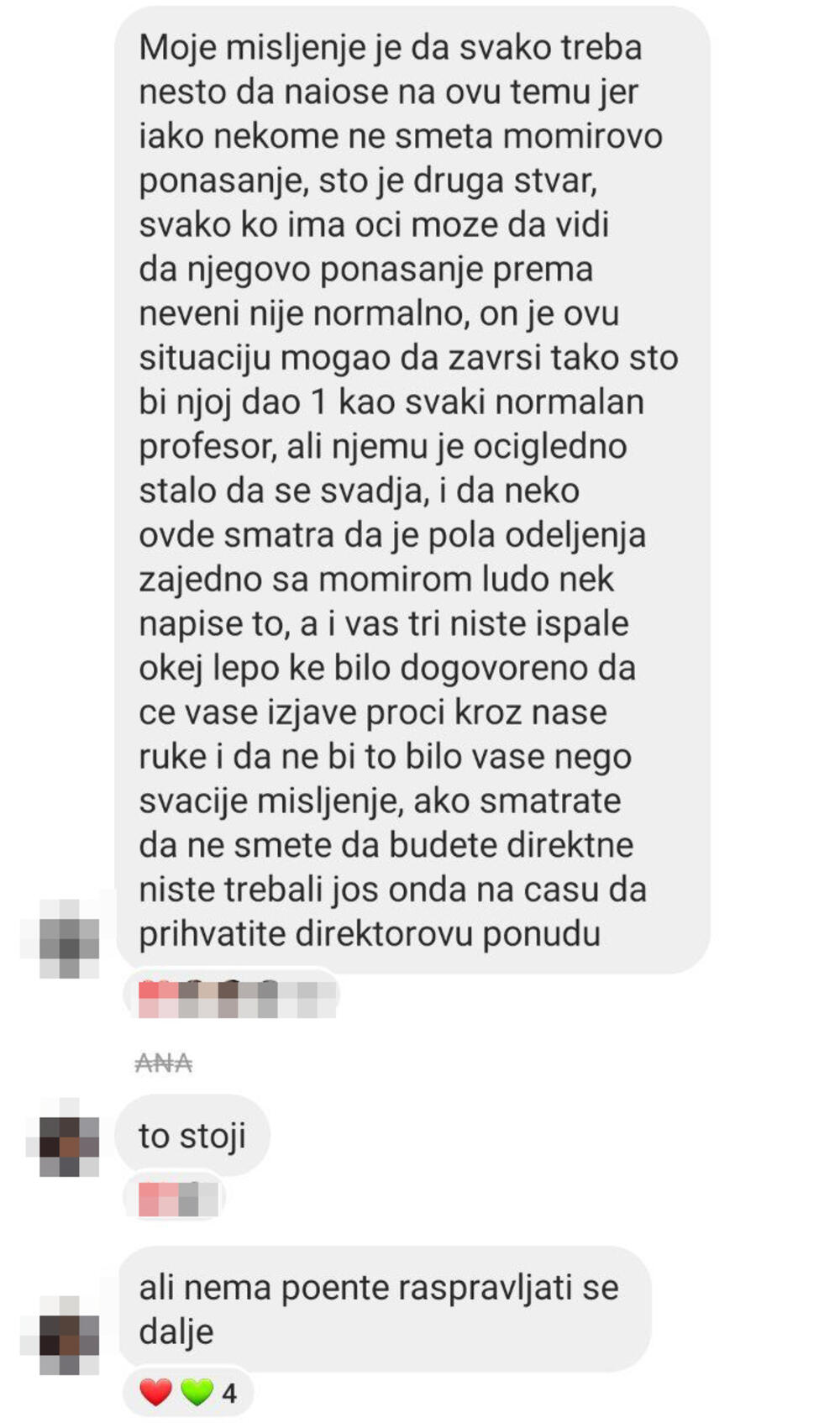 - Zbog nastale situacije u odeljenju imam potrebu da se izjasnim, sagledavajući iz lične perspektive. Događaju u kome je razredni starešina našao papire nisam prisustvovao. Jedino o čemu mogu da pričam jeste profesorovo ponašanje na času i van njega prema N. i mom ličnom iskustvu sa razrednim starešinom. Dok je N. prisustvovala časovima prvih par minuta se svodilo na razgovoru o njoj gde ona nije mogla da se odbrani jer joj ni jednog trenutka nije data reč. Jednom prilikom nakon časa želeo sam da pričam sa razrednim, kao i drugarica iz odeljenja, kada ga je drugarica pitala nešto on je vikajući odgovorio ti mi ne trebaš, ti dođi upirući prstom u N. i zalupivši vratima. Niko od nas učenika nije smeo da izađe na odmor dok nam nisu javili da oni nisu ispred. Zatim na časovima kojim N. nije prisustvovala, njegove reči su ponekad bile i uvrede, jednom prilikom je rekao kako nije normalna zato što ima probleme sa profesorima. Ostalih časova to nisu bile uvrede, ali govorio je o njoj sa indirektnim „šalama“ na njen račun. U učionici situacija je bila u redu sem ovih gore navedenih stvari. Ali bilo je situacija koje su se dešavale van učionice, a kojima sam prisustvovao. N. je imala čas van učionice sa grupom u kojoj nisam. Ja sam bio na hodniku kada je ona prišla i pitala me da li mogu da prođem pored nastavničke kancelarije da vidim da li je on tu da bi ona mogla normalno da ode na čas. Skoro je bila situacija gde se N. skrivala po školi da je on ne bi našao jer joj je neko rekao da je razredni bio tu minut pre nego što smo prolazili tuda. Van ove situacije desio se incident vezan za mene u kome je predmetni profesor izazvao svađu zbog mojih reči odbrane na njegove provokacije koje je kasnije okrakterisao kao „šale“, bio sam poslat kod psihologa gde sam rekao mišljenje vezano za problem u kome ni ja nisam bio u potpunosti u pravu. Kasnije razredni je obavio razgovor sa mnom u kome je branio profesora i molio i manipulisao da ne idem kod direktora i psihologa jer je profesor, iako mu je rečeno od strane psihologa da dođe, odbijao da ode, ja i dan danas imam probleme, ne u toj meri, sa tim profesorom i razrednim. Mislim da je razlog toga to što nisam otišao kod psihologa jer nisam želeo da se zameram razrednom jer je bilo par trenutaka kada sam ja bio komentarisan i nije mi bila data reč da se odbranim. Od jednog za mene su nastala dva problema, razredni me je okarakterisao kao loše dete pa me je često optuživao za razne stvari na primer: da bežim sa časova iako imam opravdanje i regularno sam ocenjen, da sam inicijator nekih stvari iako nemam nikakve veze s time. Do skoro sam bio komentarisan na časovima dok nije izbio ovaj veći problem sa N. Jedina razlika je ta što je N. imala hrabrosti da ode do psihologa i zameri se razrednom da bi rešila svoj problem za razliku od mene.