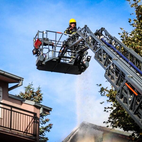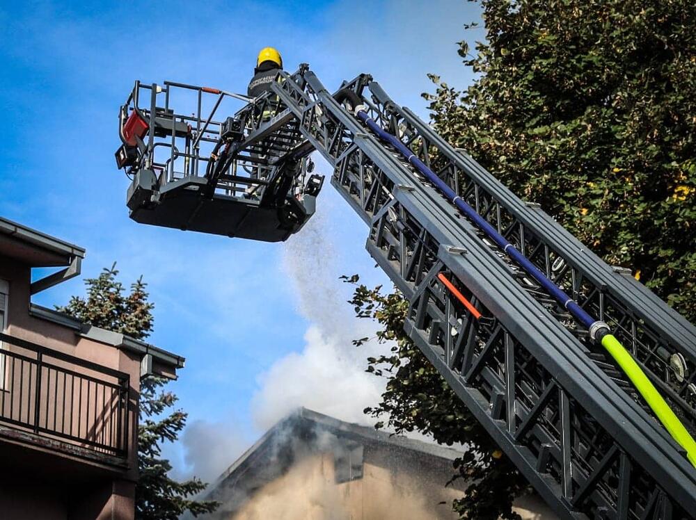 Interveniše 22 vatrogasaca sa 6 interventnih vozila. Komadi zapaljenog krova padaju na zemlju ispred zgrade.
