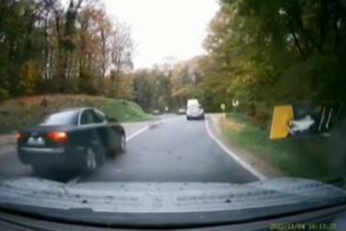 Na snimku se vidi vozilo koje pretiče na punoj liniji vozila u krivini.