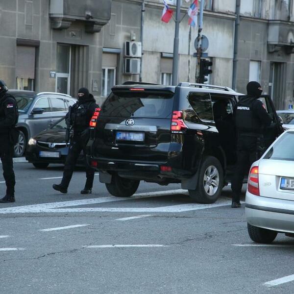 Naoružani pripadnici Žandarmerije s fantomkama i dugim cevima raspoređeni su oko i ispred suda.