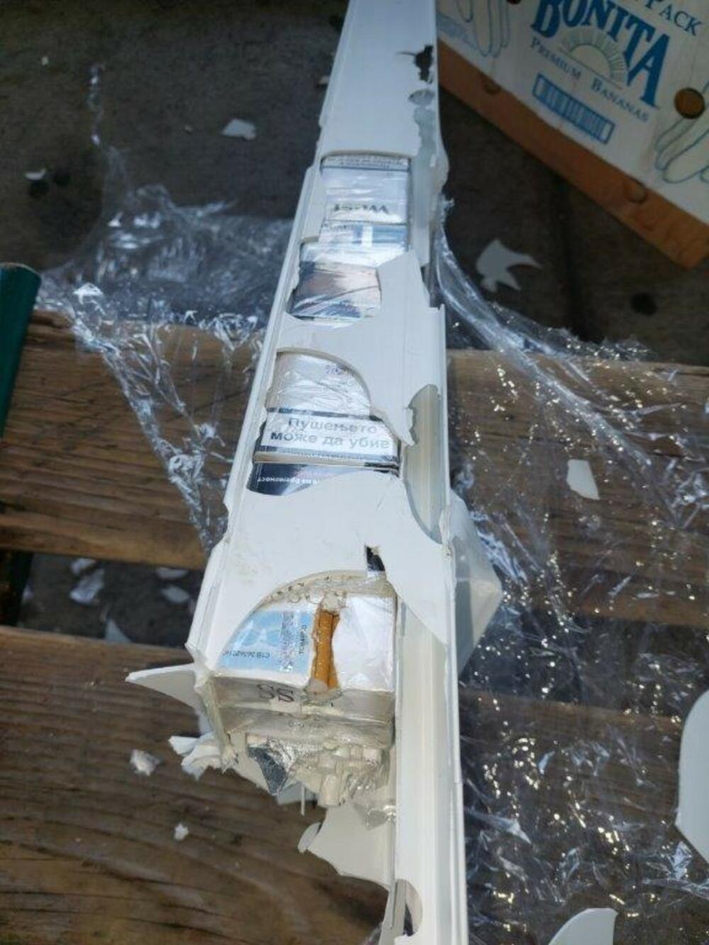 Potvrdivši da je unutrašnjost prozora ispunjena neprijavljenom robom, okvir je otvoren, a iz njega su počele da ispadaju paklice cigareta raznih robnih marki.