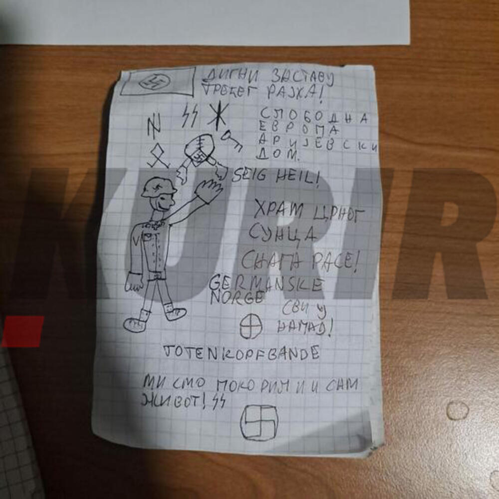 - Crteži stoje uz slogane: "Buđenje", "Nismo jednaki, nismo isti", "Hram crnog sunca, snaga rase" i slični. Takođe, nađen je spisak sa naslovom "25 tačaka nacističke partije" - kaže naš sagovornik upoznat sa slučajem.