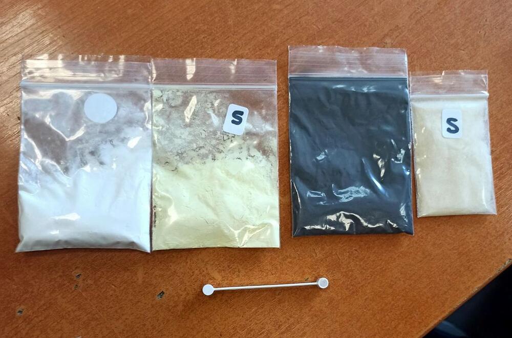 U pošiljci su pronađene četiri pvc kesice ispunjene prahom bele, žućkaste i crne boje, zajedno sa dozerom za punjenje.