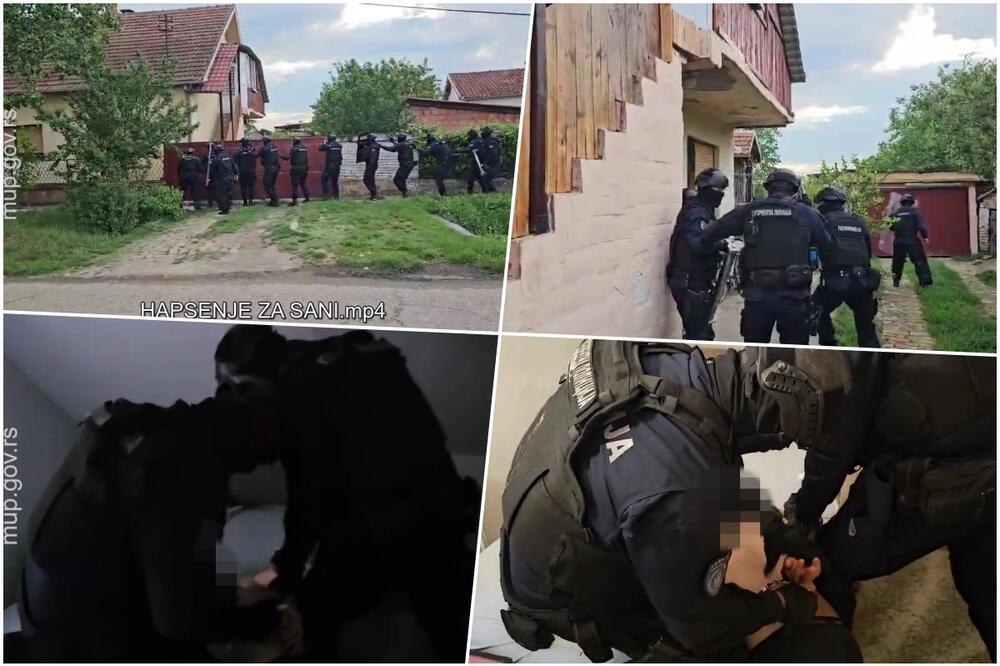 Na snimku hapšenja koji je objavio MUP Srbije vidi se kako veća grupa policajaca sa štitovima i opremom za razvaljivanje vrata ulaze u dvorište, a potom i u kuću.