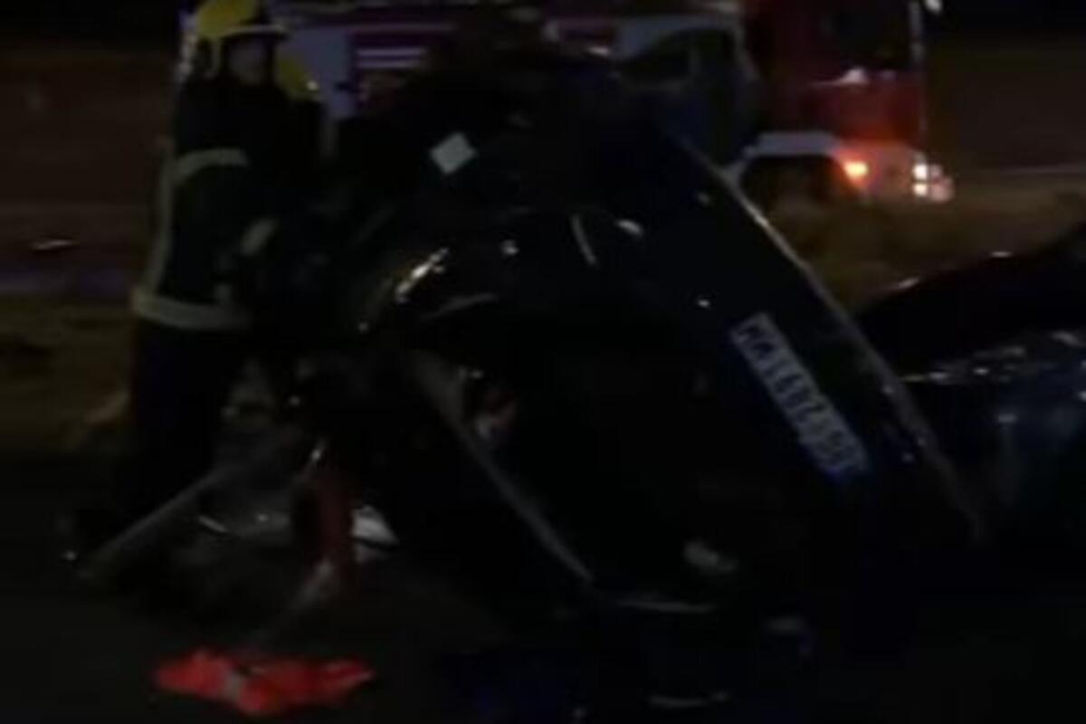 Na snimku se vidi da je automobil prevrnut i zgužvan, delovi auta su rasuti svuda po putu, a na licu mesta nalazi se i policija.