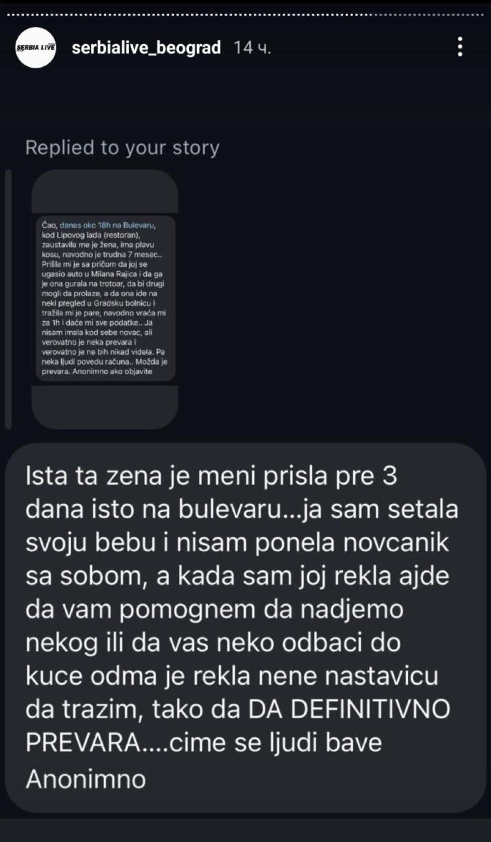 - Danas na Bulevaru kod Lipovog lada zaustavila me žena ima plavu kosu navodno je trudna sedmi mesec... Priša mi je sa pričom da joj se ugasio auto u Milana Rakića i da ga je ona gurala na trotoar da bi drugi mogli da prolaze, a da ona ide na neki pregled u Gradsku bolnicu i tražila mi pare. Navodno vraća mi za jedan sat i daće mi sve podatke. Ja nisam imala kod sebe novac, ali verovatno je neka prevara i verovatno je ne bih nikad videla. Neka ljudi povedu računa. Možda je prevara - piše u prvoj objavi, a u drugoj stoji: