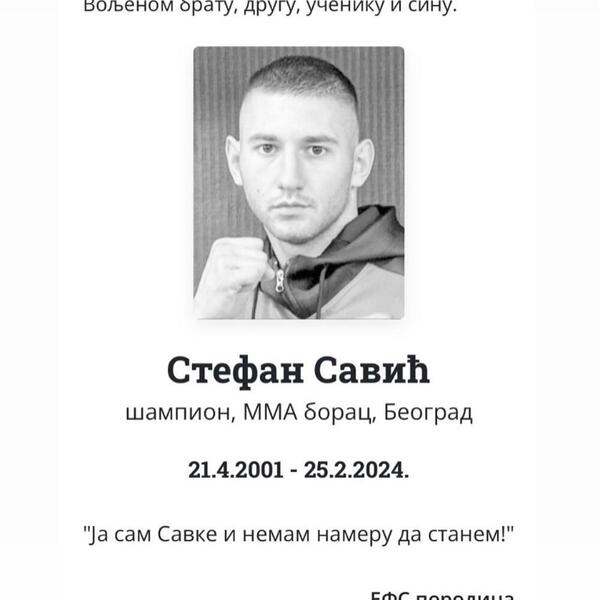 Stefan Savić (23), mladi reprezentativac Srbije i MMA borac, ubijen je u noći između 24. i 25. februara 2024. godine ispred jednog ugostiteljskog objekta na Dorćolu. Za njegovo ubistvo osumnjičeni su Vasilije Gačević i Marko Daničić. Ubice su Stefana nasmrt izbole nožem čak 19 puta, a ubistvo su zabeležile i kamere. Nakon likvidacije, pobegli su sa mesta zločina i od tada se nalaze u bekstvu.