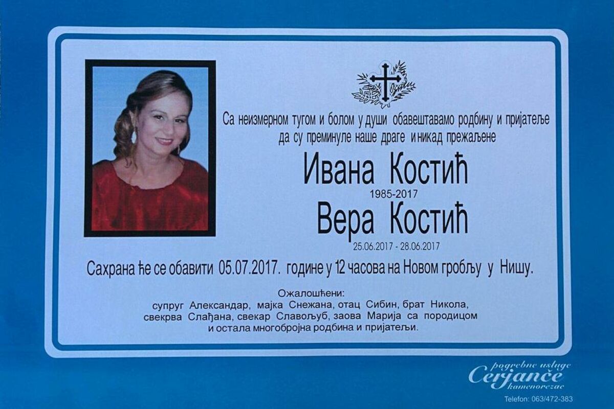 Ivana je preminula 2. jula u bolnici u Višegradskoj gde je iz niške Ginekološko akušerske klinike upućena na dalje zbrinjavanje, četiri dana nakon smrti svog novorođenčeta.