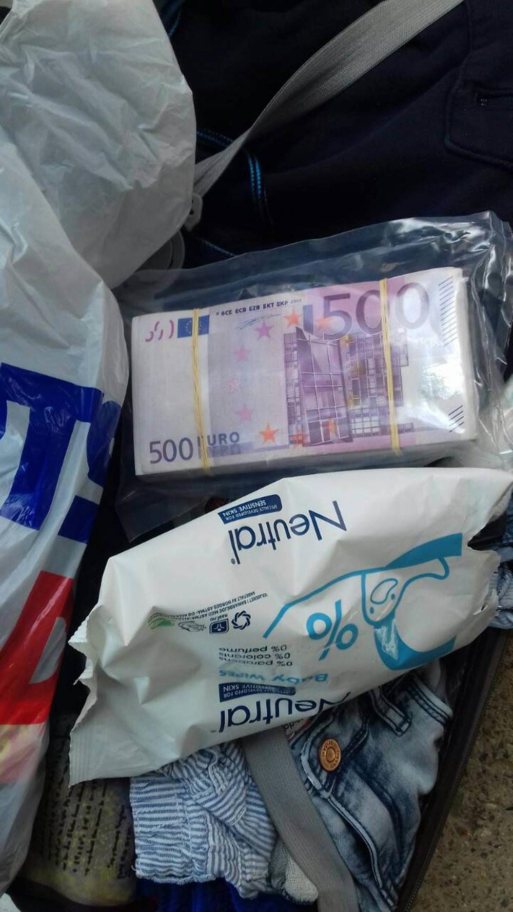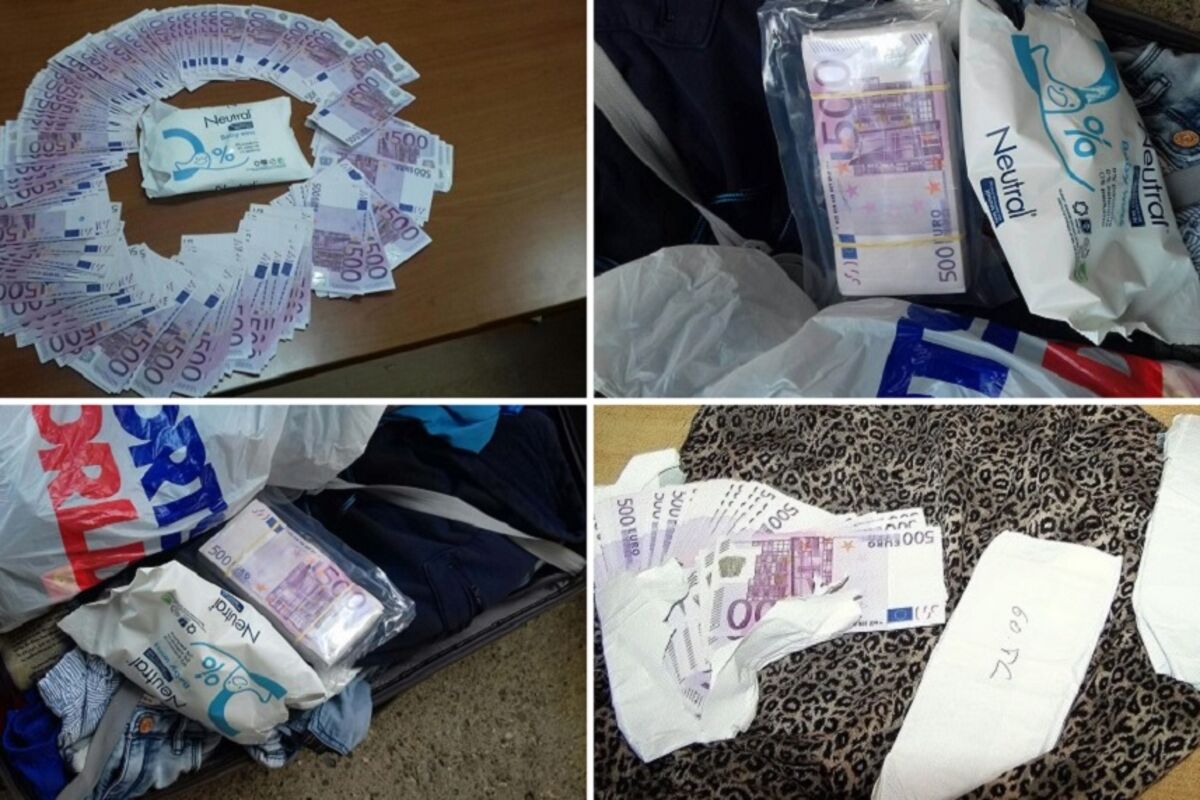 Utvrđeno je da je suvozač struk obmotao maramom ispod koje su se krile tri koverte sa 292 novčanice od po 500 evra.