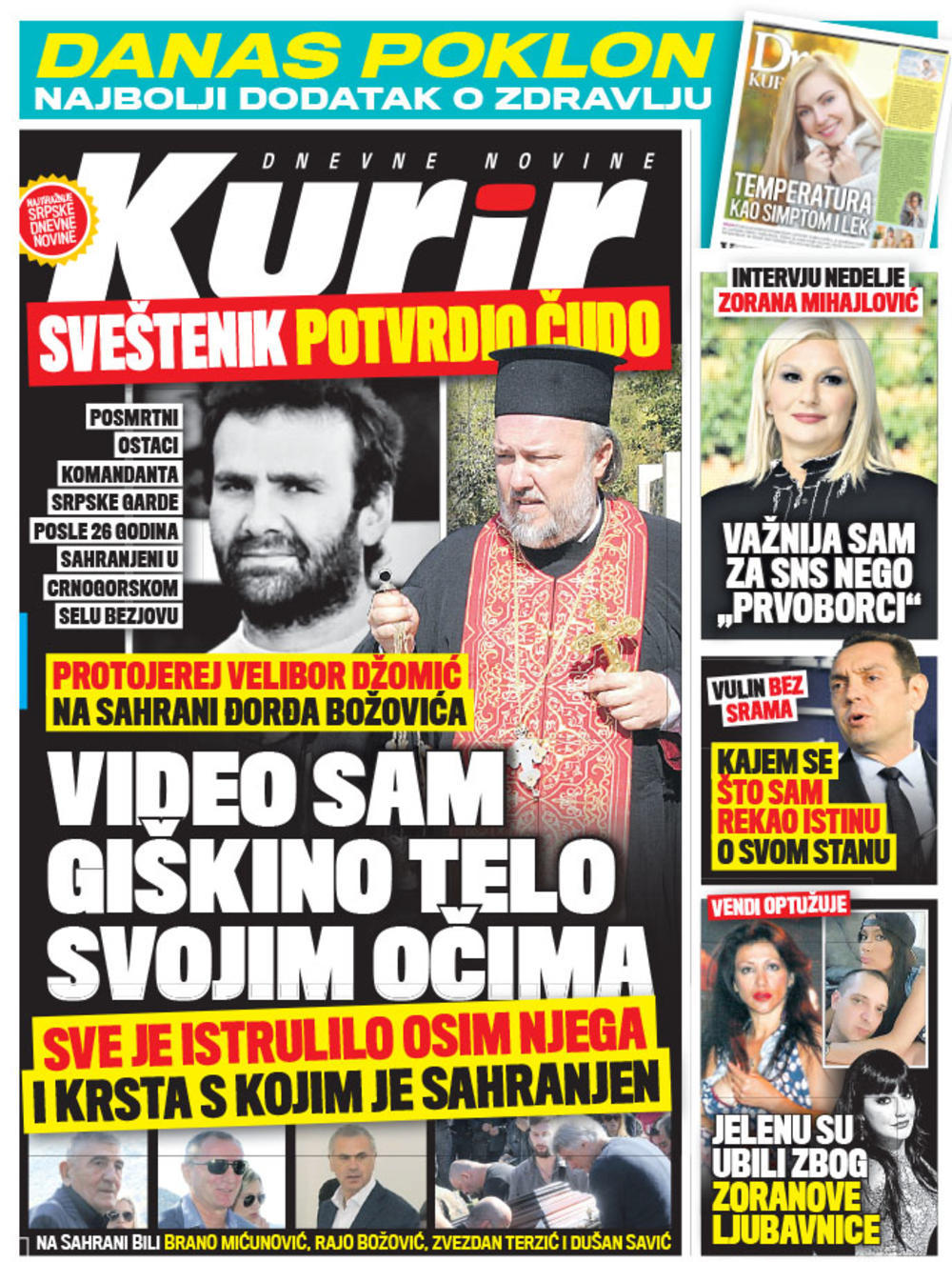 EKSKLUZIVNO svedočenje sveštenika koji je video i dodirnuo telo Božovića koje ni nakon 26 godina nije istrulilo, zašto smatra da reč o božjem znamenju, kakav znak on vidi u ovom slučaju, kako je moguće da istrule lim i drvo ali ne i Giškino telo, kakve veze to ima sa Svetim pismom koje čuva Božovićeva porodica ČITAJTE U KURIRU.