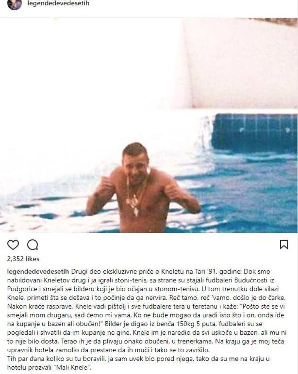"Dok smo nabildovani Kneletov drug i ja igrali stoni tenis, sa strane su stajali fudbaleri Budućnosti iz Podgorice i smejali se bilderu koji je bio očajan u stonom tenisu. U tom trenutku dole silazi Knele, primeti šta se dešava i to počinje da ga nervira. Reč tamo, reč 'vamo, došlo je do čarke. Nakon kraće rasprave, Knele vadi pištolj i sve fudbalere tera u teretanu i kaže: