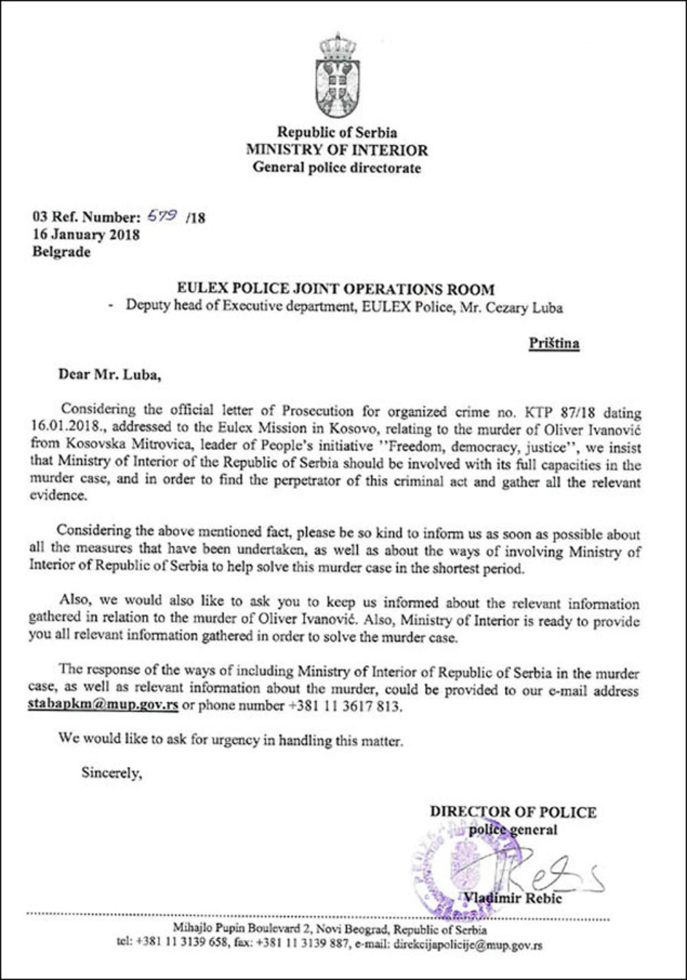 U MUP podsećaju da su tokom jučerašnjeg dana, odmah nakon upućenog zvaničnog dokumenta Tužilaštva za organizovani kriminal, kojim se zahteva učešće naših istražnih organa u sprovođenju istrage o ubistvu Ivanovića, više puta kontaktirali predstavnike Euleksa i UNMIK-a.