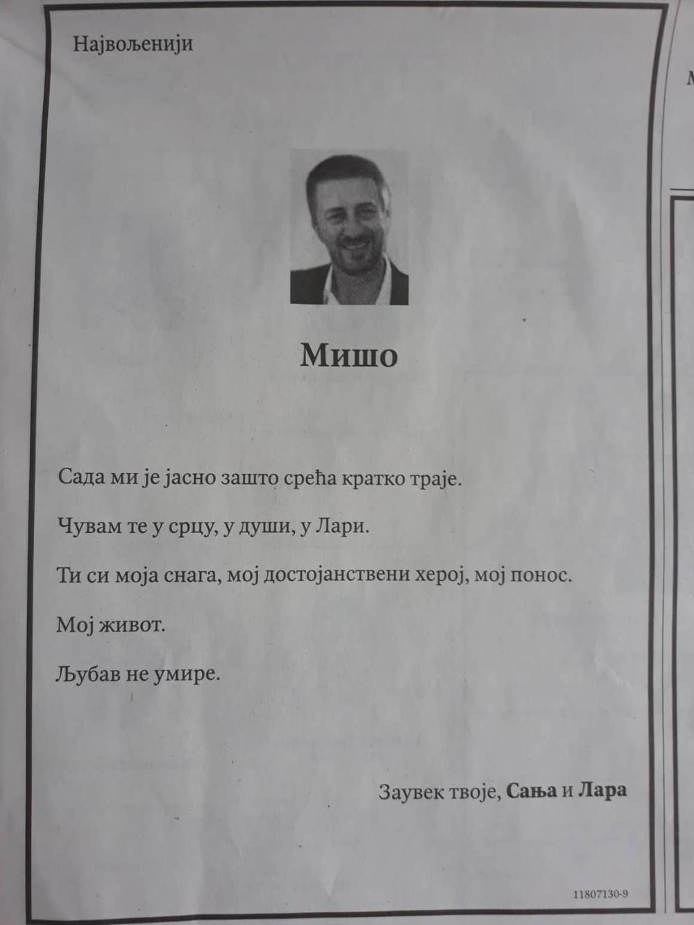 Najvoljeniji Mišo Sada mi je jasno zašto sreća kratko traje. Čuvam te u srcu, u duši, u Lari. Ti si moja snaga, moj dostojanstveni heroj, moj ponos. Moj život. Ljubav ne umire. Zauvek tvoje, Sanja i Lara - stihovi su koji će mnogima naterati suze na oči.
