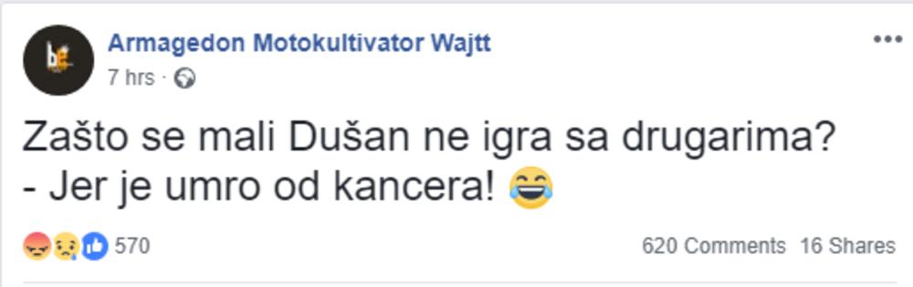 - Zašto mali Dušan ne može da radi sklekove? - Jer udara glavom o sanduk! - reči su jednog korisnika Fejsbuka, koje su razočarale mnoge, napale svaku veru u ljude i ljudskost, ali i zaprepastile sve ljude koji ovo pročitali.