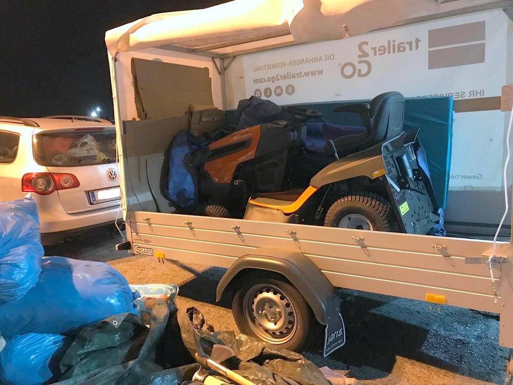 Kada je carinik, želeći da proveri o kakvim polovnim stvarima je reč, zavirio ispod cerade auto-prikolice, u njenom srednjem delu je ispod dušeka, kofera i džakova pronašao i novo vozilo za košenje i sakupljanje trave marke „huskvarna“. Prema računu koji je takođe naknadno pronađen njegova vrednost je 3.700 evra.