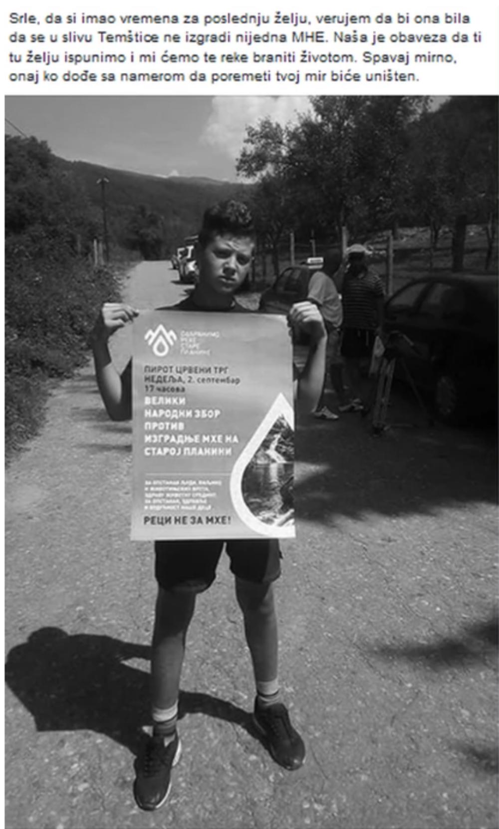 - Srle, da si imao vremena za poslednju želju, verujem da bi ona bila da se u slivu Temštice ne izgradi nijedna MHE. Naša je obaveza da ti tu želju ispunimo i mi ćemo te reke braniti životom. Spavaj mirno, onaj ko dođe sa namerom da poremeti tvoj mir biće uništen - jedna je od objava kojom se poznanici i prijatelji ovog tinejdžera pozdravljaju, pišu mediji.